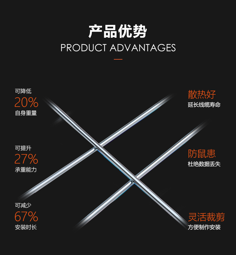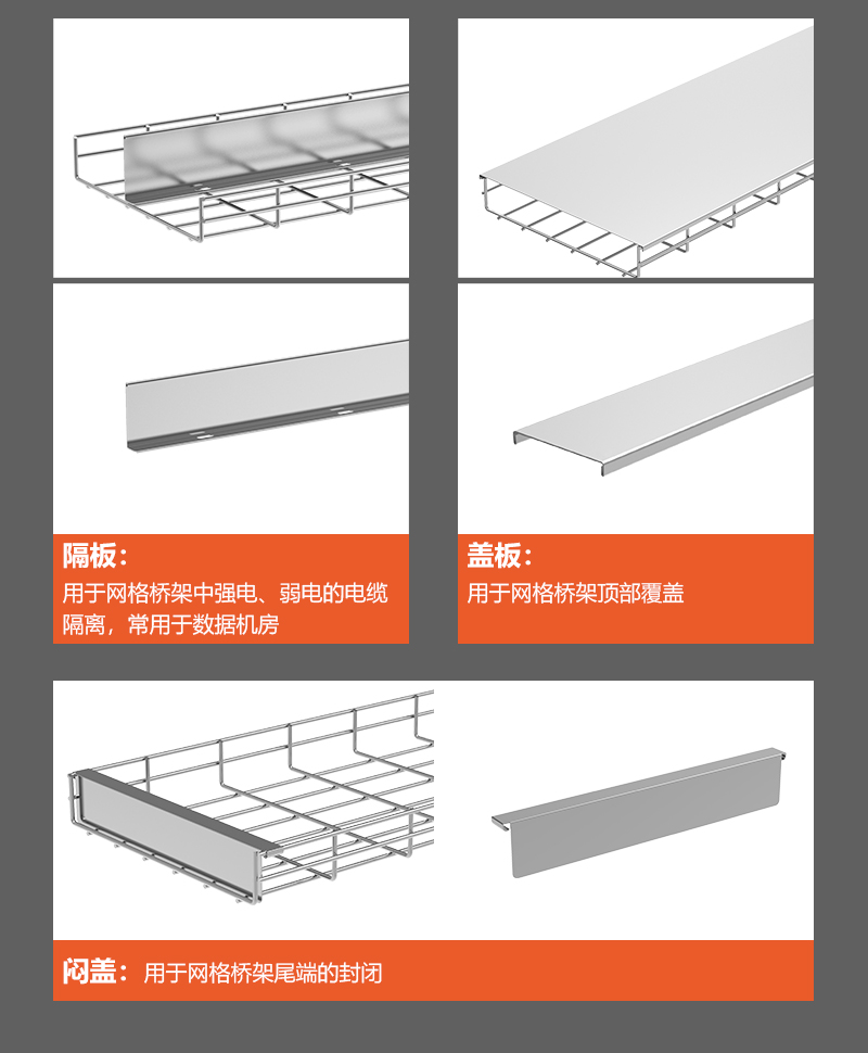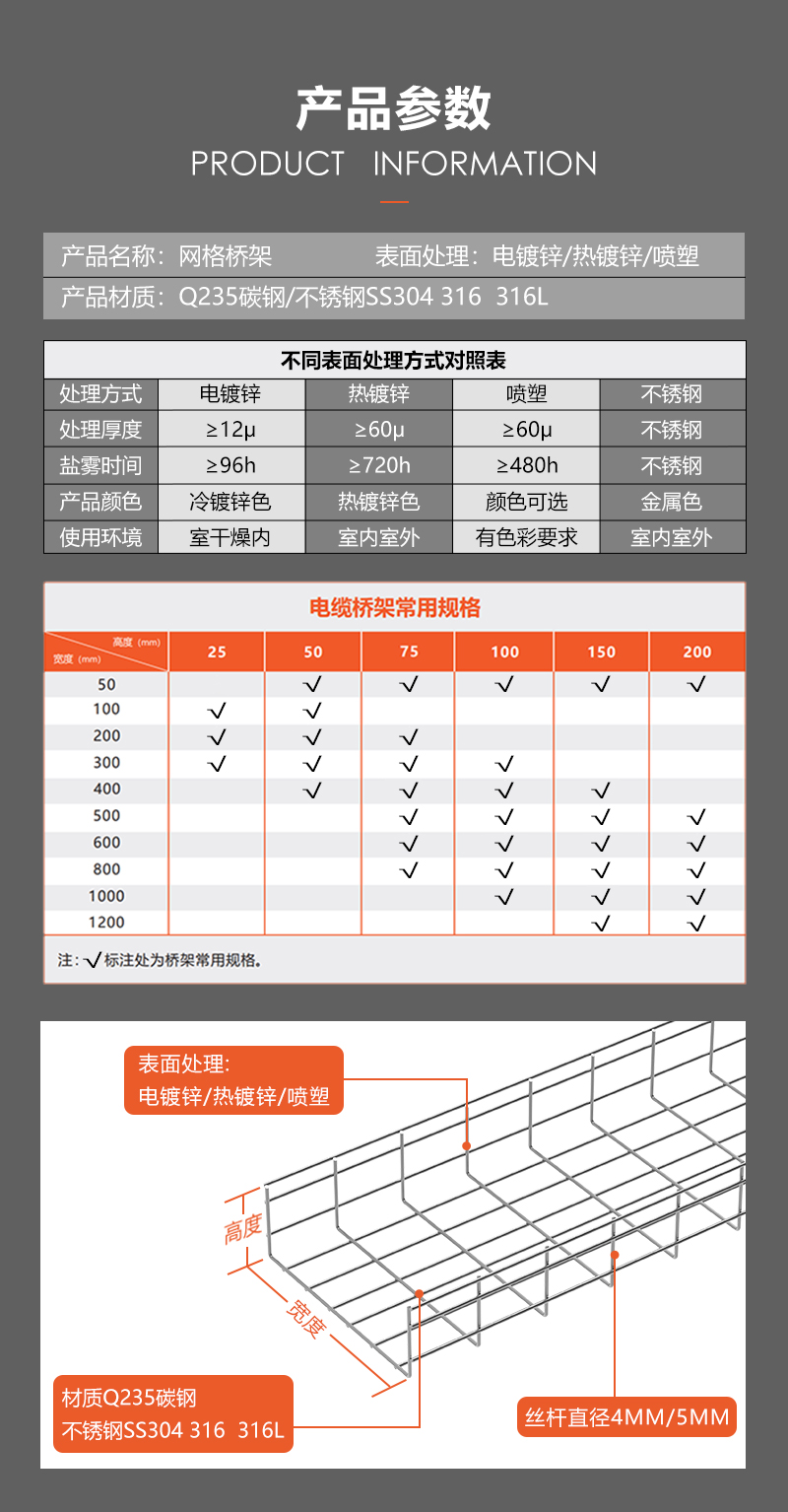 CM代表网格桥架,100x150体现高100mmx宽150mm,高宽都是指桥架内尺寸。丝径可以在3.5mm-6.0mm定制(丝径常用是5.0mm)。